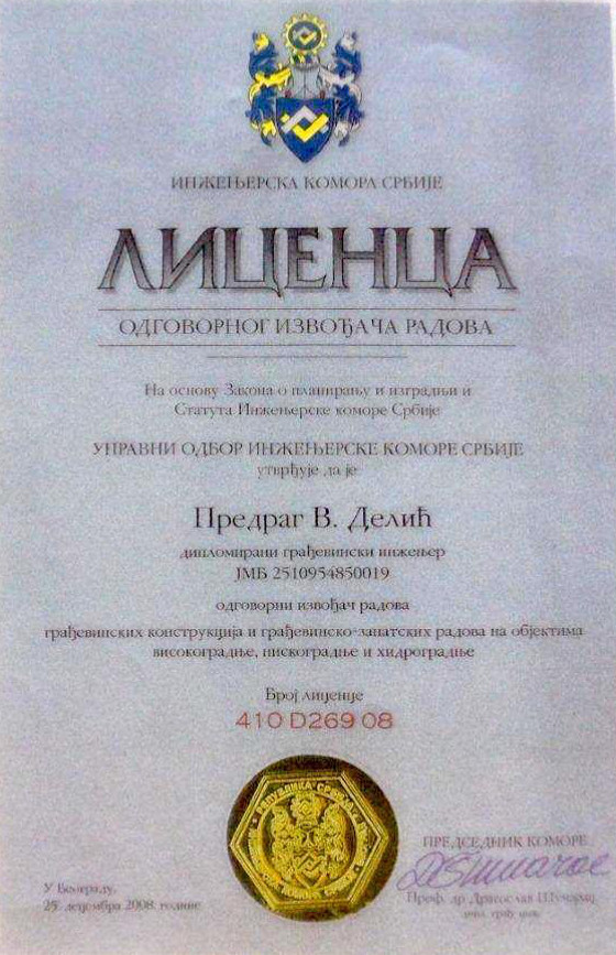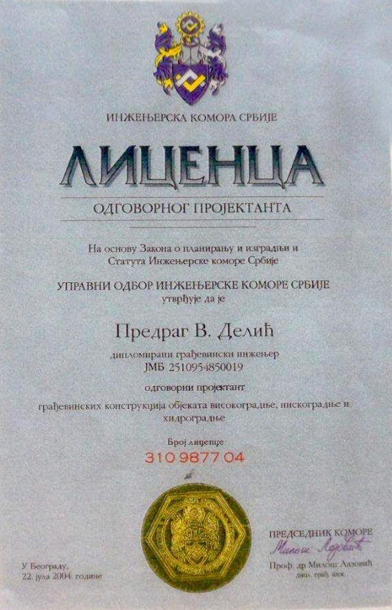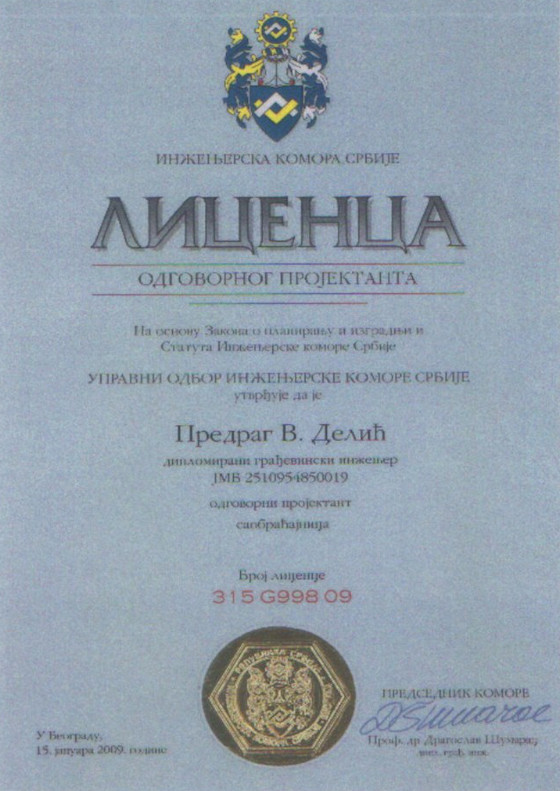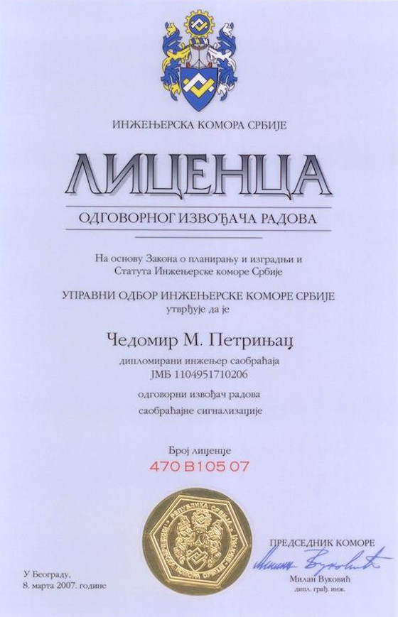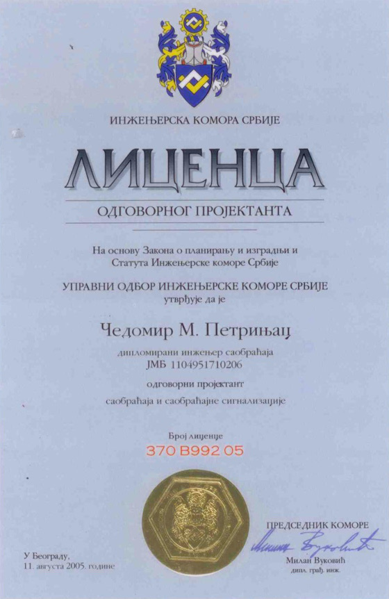 Posedujemo Republičku licencu P112S1 za projektovanje saobraćaja i saobraćajne signalizacije za objekte niskogradnje na aerodromskom kompleksu (poletno-sletne staze, rulne staze, pristanišne platforme, hangarske platforme)